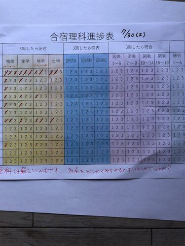 さあ始まったぜ! 通い合宿 今年は昨年とまた変更があって 7:30-19:05 昼食のみ提供 勉強時間は変わらない そしてこれだけの量をやるのだ 理科プリント枚数49枚 地理プリント枚数26枚 歴史プリント枚数29枚 これを3周やるのが目標です 教科書を調べ、教科…